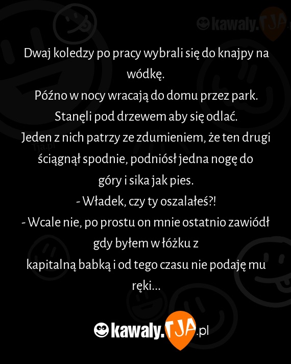 Jeden z nich patrzy ze zdumieniem, że ten drugi ściągnął spodnie, podniósł jedna nogę do góry i sika jak pies.
