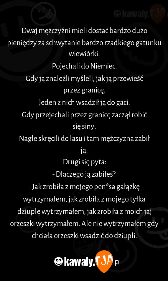 - Jak zrobiła z mojego pen*sa gałązkę wytrzymałem, jak zrobiła z mojego tyłka dziuplę wytrzymałem, jak zrobiła z moich jaj orzeszki wytrzymałem. Ale nie wytrzymałem gdy chciała orzeszki wsadzić do dziupli.