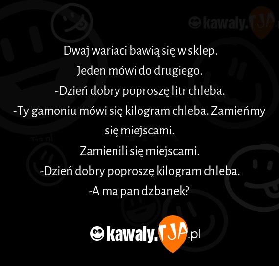 Dwaj wariaci bawią się w sklep. Jeden mówi do drugiego. -Dzień dobry poproszę litr chleba. -Ty gamoniu mówi się kilogram chleba. Zamieńmy się miejscami. Zamienili się miejscami. -Dzień dobry poproszę kilogram chleba. -A ma pan dzbanek?