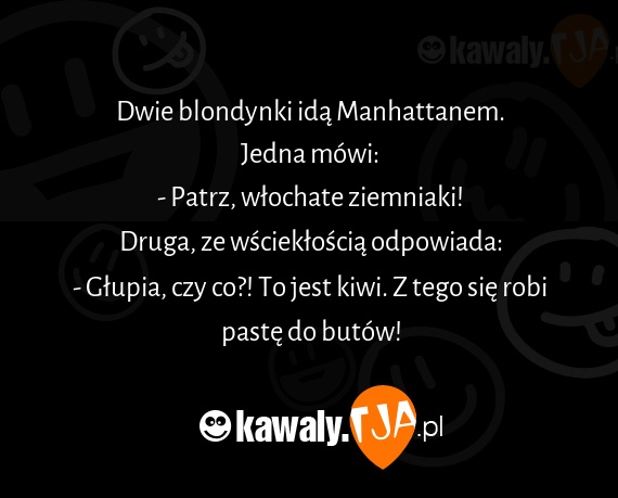Dwie blondynki idą Manhattanem. Jedna mówi: - Patrz, włochate ziemniaki! Druga, ze wściekłością odpowiada: - Głupia, czy co?! To jest kiwi. Z tego się robi pastę do butów!