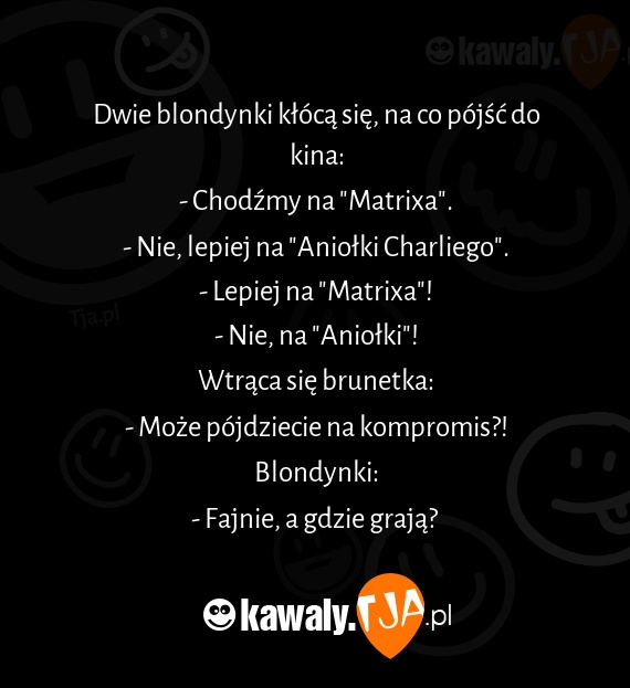 Dwie blondynki kloca sie, na co pojsc do kina: - Chodxmy na "Matrixa". - Nie, lepiej na "Aniolki Charliego". - Lepiej na "Matrixa"! - Nie, na "Aniolki"! Wtraca sie brunetka: - Moze pojdziecie na kompromis?! Blondynki: - Fajnie, a gdzie graja?