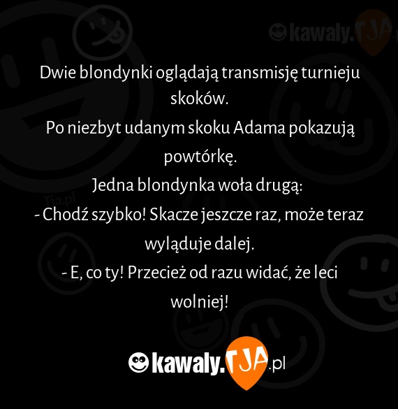 Dwie blondynki ogladaja transmisje turnieju skokow. Po niezbyt udanym skoku Adama pokazuja powtorke. Jedna blondynka wola druga: - Chodx szybko! Skacze jeszcze raz, moze teraz wyladuje dalej. - E, co ty! Przeciez od razu widac, ze leci wolniej!