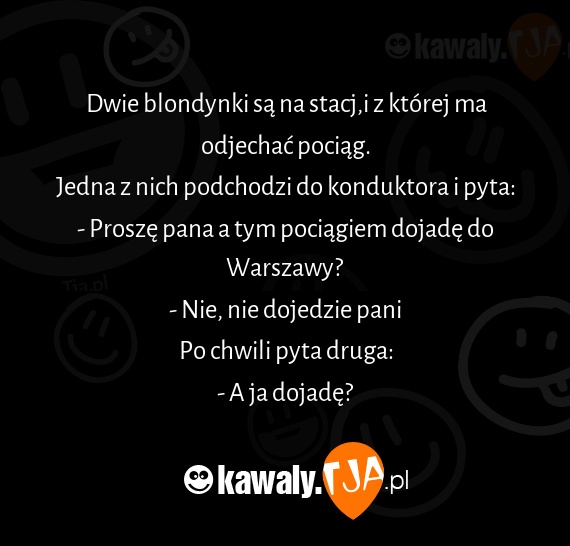 Dwie blondynki są na stacj,i z której ma odjechać pociąg. Jedna z nich podchodzi do konduktora i pyta: - Proszę pana a tym pociągiem dojadę do Warszawy? - Nie, nie dojedzie pani Po chwili pyta druga: - A ja dojadę?