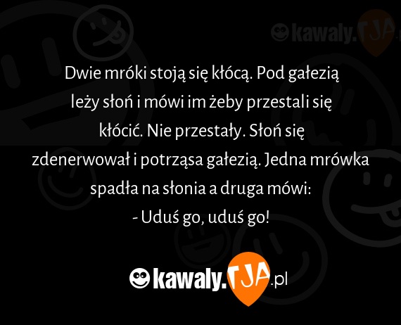 Dwie mróki stoją się kłócą. Pod gałezią leży słoń i mówi im żeby przestali się kłócić. Nie przestały. Słoń się zdenerwował i potrząsa gałezią. Jedna mrówka spadła na słonia a druga mówi: - Uduś go, uduś go!