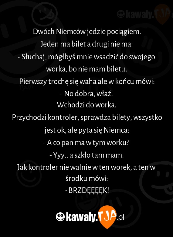 Przychodzi kontroler, sprawdza bilety, wszystko jest ok, ale pyta się Niemca: