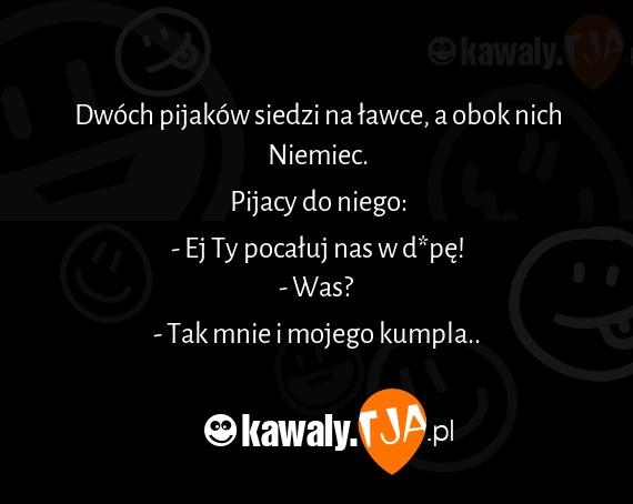 Dwoch pijakow siedzi na lawce, a obok nich Niemiec. Pijacy do niego: - Ej Ty pocaluj nas w dupe! - Was? - Tak mnie i mojego kumpla..