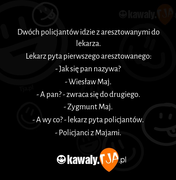 Dwóch policjantów idzie z aresztowanymi do lekarza. Lekarz pyta pierwszego aresztowanego: - Jak się pan nazywa? - Wiesław Maj. - A pan? - zwraca się do drugiego. - Zygmunt Maj. - A wy co? - lekarz pyta policjantów. - Policjanci z Majami.
