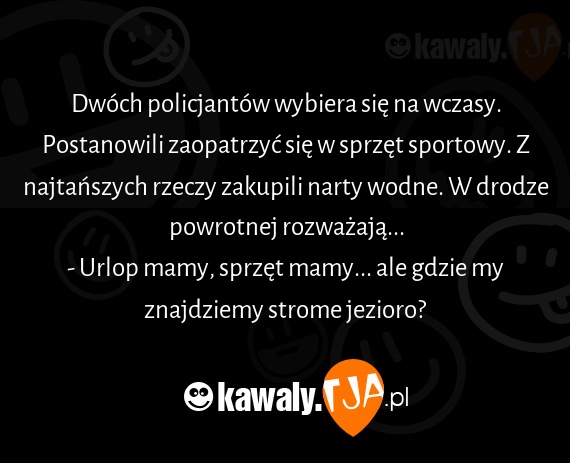 [url=https://kawaly.tja.pl/dowcip,dwoch-policjantow-wybiera-sie-na]Dwóch policjantów wybiera się na wczasy. Postanowili zaopatrzyć się w sprzęt sportowy. Z najtańszych rzeczy zakupili narty wodne. W drodze powrotnej rozważają...