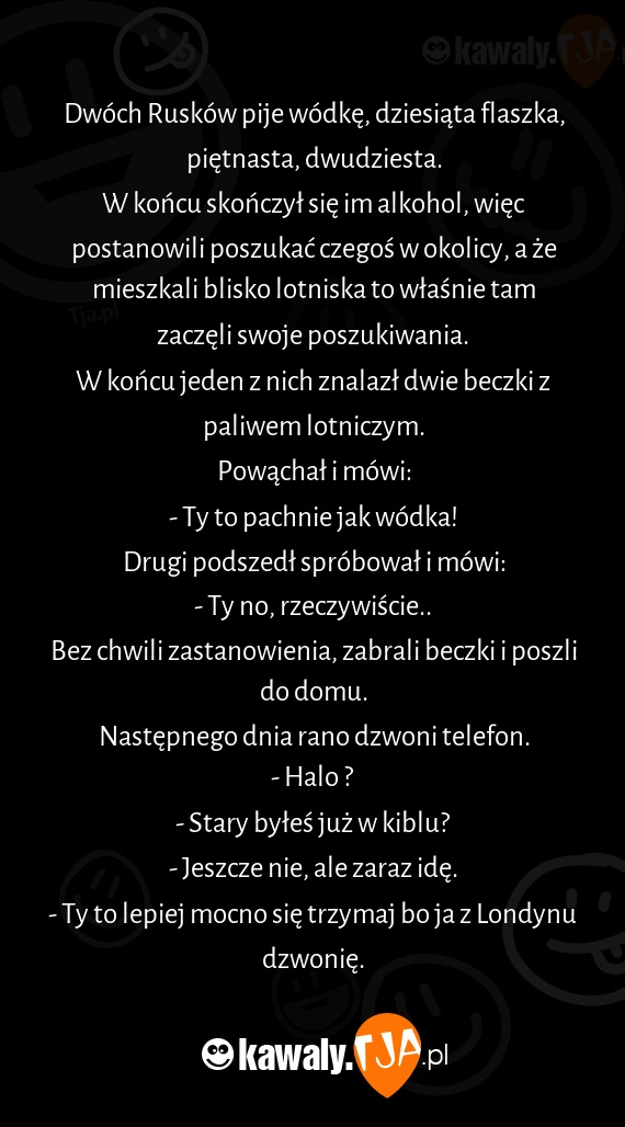 Dwóch Rusków pije wódkę, dziesiąta flaszka, piętnasta, dwudziesta.