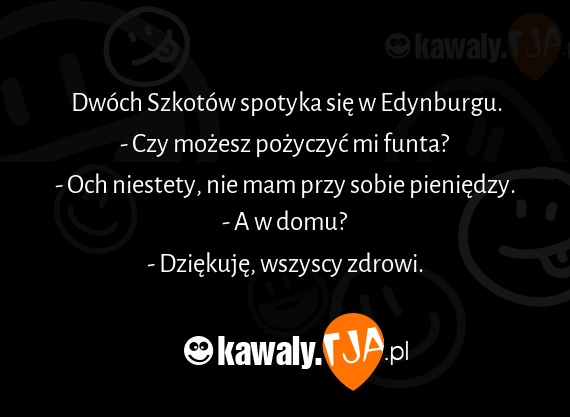 Dwoch Szkotow spotyka sie w Edynburgu. - Czy mozesz pozyczyc mi funta? - Och niestety, nie mam przy sobie pieniedzy. - A w domu? - Dziekuje, wszyscy zdrowi.