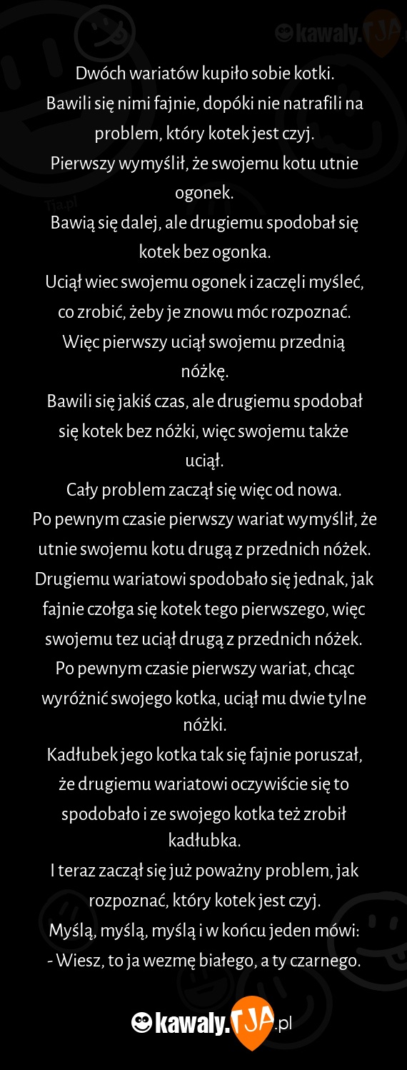 Po pewnym czasie pierwszy wariat, chcąc wyróżnić swojego kotka, uciął mu dwie tylne nóżki.