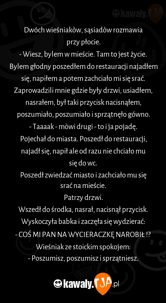 - Wiesz, bylem w mieście. Tam to jest życie. Bylem głodny poszedłem do restauracji najadłem się, napiłem a potem zachciało mi się srać. Zaprowadzili mnie gdzie były drzwi, usiadłem, nasrałem, był taki przycisk nacisnąłem, poszumiało, poszumiało i sprzątnęło gówno.