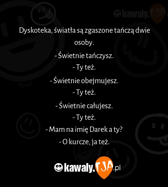 Dyskoteka, swiatla sa zgaszone tancza dwie osoby. - Swietnie tanczysz. - Ty tez. - Swietnie obejmujesz. - Ty tez. - Swietnie calujesz. - Ty tez. - Mam na imie Darek a ty? - O kurcze, ja tez.