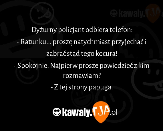 Dyżurny policjant odbiera telefon: - Ratunku... proszę natychmiast przyjechać i zabrać stąd tego kocura! - Spokojnie. Najpierw proszę powiedzieć z kim rozmawiam? - Z tej strony papuga.