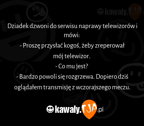 Dziadek dzwoni do serwisu naprawy telewizorów i mówi: - Proszę przysłać kogoś, żeby zreperował mój telewizor. - Co mu jest? - Bardzo powoli się rozgrzewa. Dopiero dziś oglądałem transmisję z wczorajszego meczu.