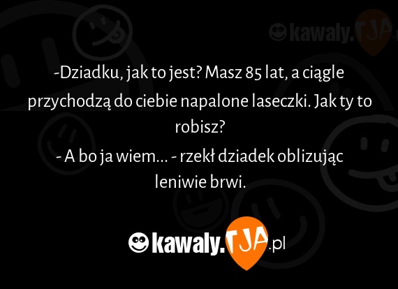 -Dziadku, jak to jest? Masz 85 lat, a ciagle przychodza do ciebie napalone laseczki. Jak ty to robisz? - A bo ja wiem... - rzekl dziadek oblizujac leniwie brwi.