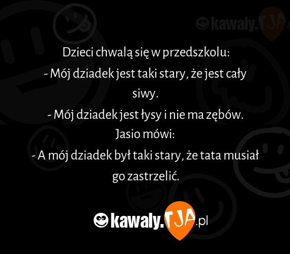 Dzieci chwalą się w przedszkolu: - Mój dziadek jest taki stary, że jest cały siwy. - Mój dziadek jest łysy i nie ma zębów. Jasio mówi: - A mój dziadek był taki stary, że tata musiał go zastrzelić.