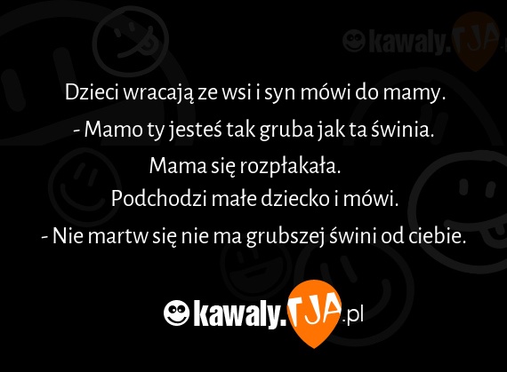 Dzieci wracają ze wsi i syn mówi do mamy. - Mamo ty jesteś tak gruba jak ta świnia. Mama się rozpłakała. Podchodzi małe dziecko i mówi. - Nie martw się nie ma grubszej świni od ciebie.