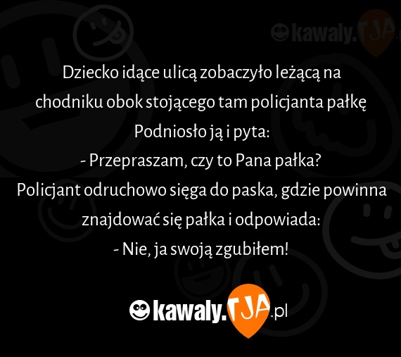 Dziecko idące ulicą zobaczyło leżącą na chodniku obok stojącego tam policjanta pałkę Podniosło ją i pyta: - Przepraszam, czy to Pana pałka? Policjant odruchowo sięga do paska, gdzie powinna znajdować się pałka i odpowiada: - Nie, ja swoją zgubiłem!