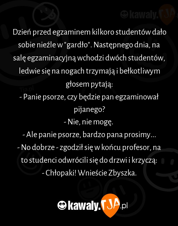 Dzień przed egzaminem kilkoro studentów dało sobie nieźle w "gardło". Następnego dnia, na salę egzaminacyjną wchodzi dwóch studentów, ledwie się na nogach trzymają i bełkotliwym głosem pytają: