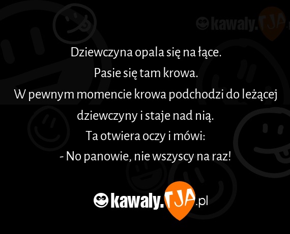 Dziewczyna opala sie na lace. Pasie sie tam krowa. W pewnym momencie krowa podchodzi do lezacej dziewczyny i staje nad nia. Ta otwiera oczy i mowi: - No panowie, nie wszyscy na raz!