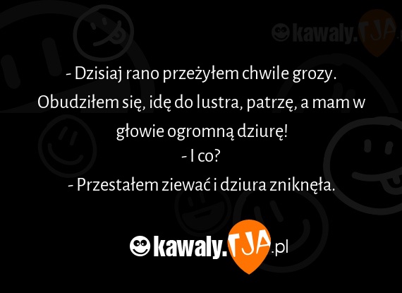 - Dzisiaj rano przeżyłem chwile grozy. Obudziłem się, idę do lustra, patrzę, a mam w głowie ogromną dziurę! - I co? - Przestałem ziewać i dziura zniknęła.
