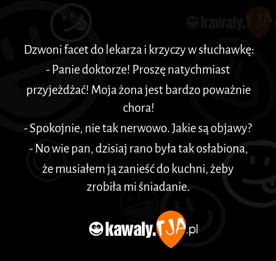 - Panie doktorze! Proszę natychmiast przyjeżdżać! Moja żona jest bardzo poważnie chora!
