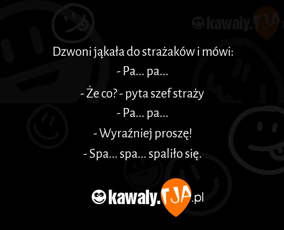 Dzwoni jąkała do strażaków i mówi: - Pa... pa... - Że co? - pyta szef straży - Pa... pa... - Wyraźniej proszę! - Spa... spa... spaliło się.