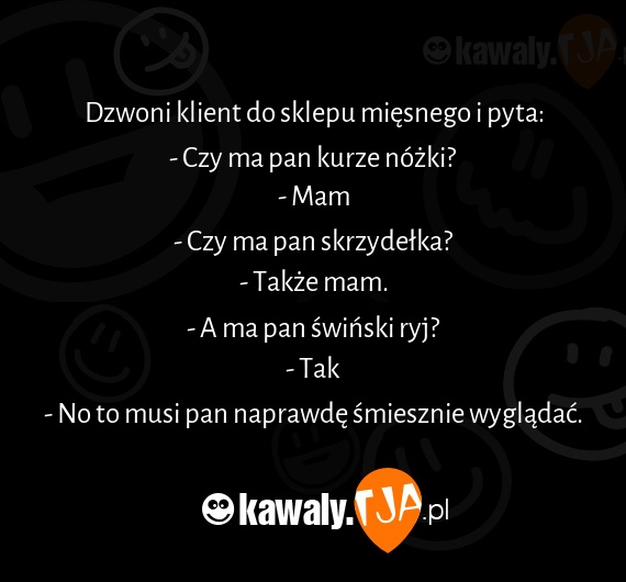Dzwoni klient do sklepu mięsnego i pyta: - Czy ma pan kurze nóżki? - Mam - Czy ma pan skrzydełka? - Także mam. - A ma pan świński ryj? - Tak - No to musi pan naprawdę śmiesznie wyglądać.