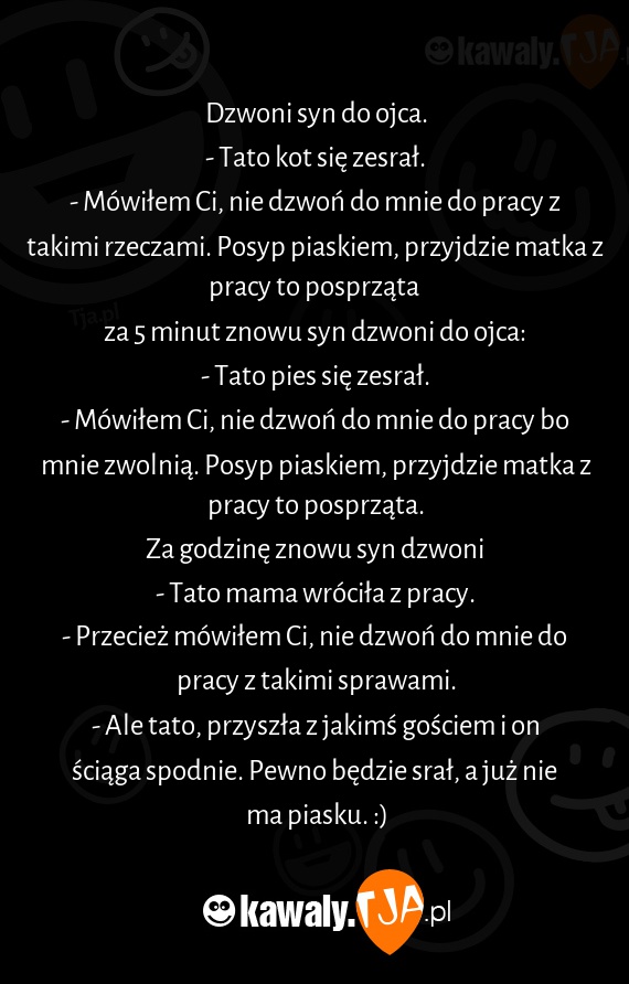 - Mówiłem Ci, nie dzwoń do mnie do pracy bo mnie zwolnią. Posyp piaskiem, przyjdzie matka z pracy to posprząta.