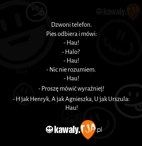 Dzwoni telefon. Pies odbiera i mówi: - Hau! - Halo? - Hau! - Nic nie rozumiem. - Hau! - Proszę mówić wyraźniej! - H jak Henryk, A jak Agnieszka, U jak Urszula: Hau!