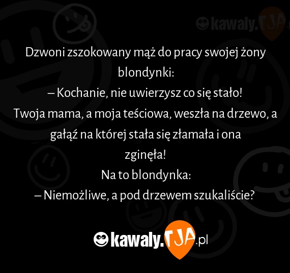 Dzwoni zszokowany mąż do pracy swojej żony blondynki: – Kochanie, nie uwierzysz co się stało! Twoja mama, a moja teściowa, weszła na drzewo, a gałąź na której stała się złamała i ona zginęła! Na to blondynka: – Niemożliwe, a pod drzewem szukaliście?