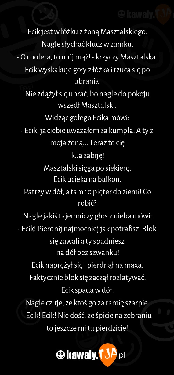 - Ecik, ja ciebie uważałem za kumpla. A ty z moja żoną... Teraz to cię