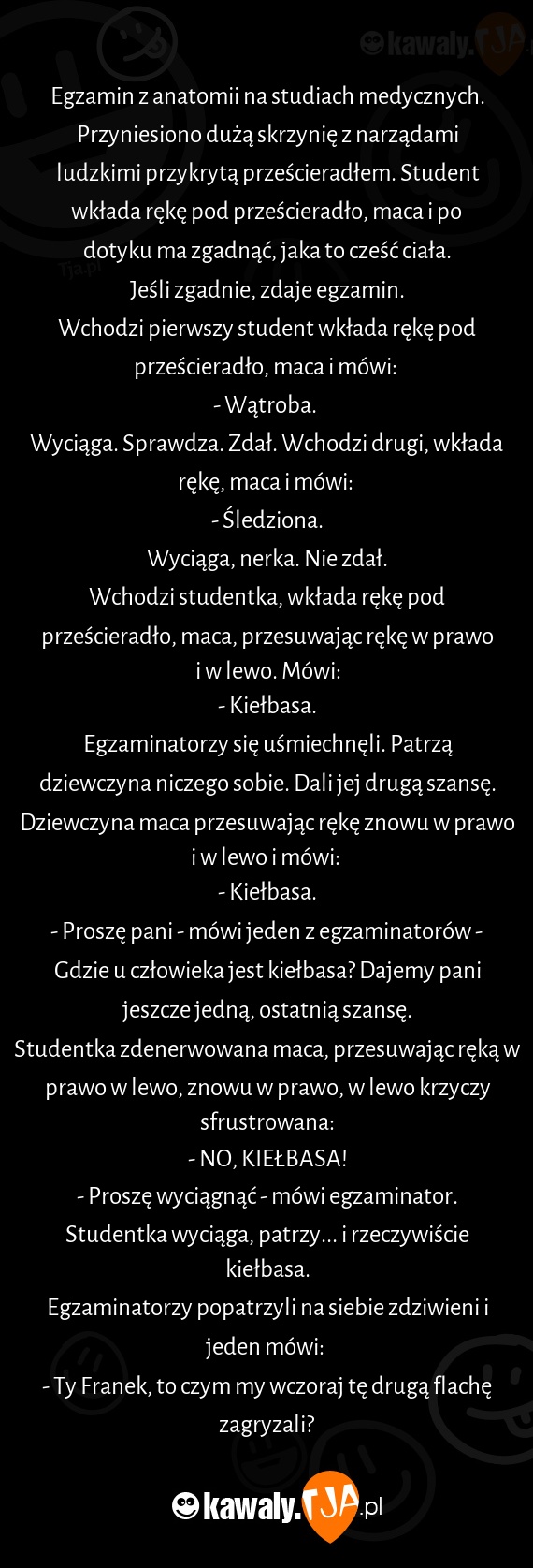 - Proszę pani - mówi jeden z egzaminatorów - Gdzie u człowieka jest kiełbasa? Dajemy pani jeszcze jedną, ostatnią szansę.