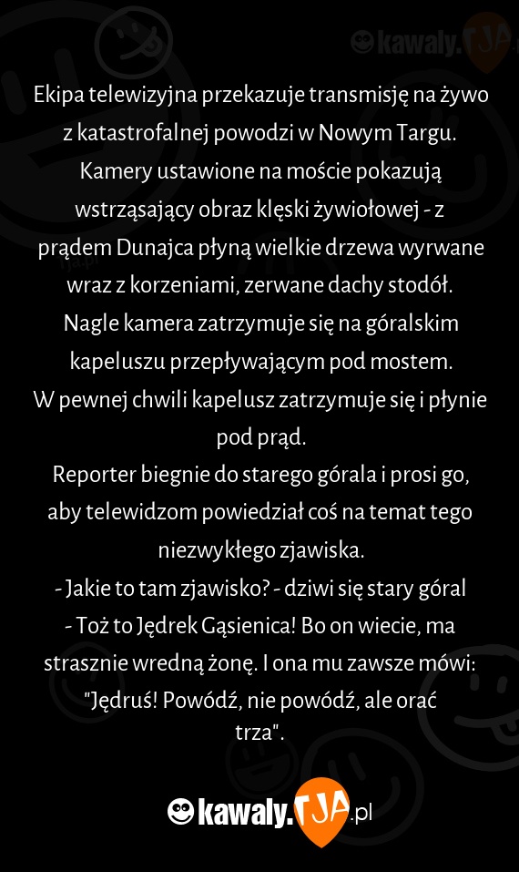- Jakie to tam zjawisko? - dziwi się stary góral - Toż to Jędrek Gąsienica! Bo on wiecie, ma strasznie wredną żonę. I ona mu zawsze mówi: "Jędruś! Powódź, nie powódź, ale orać trza".