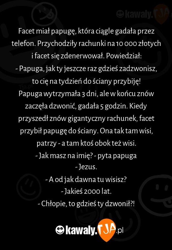 Facet miał papugę, która ciągle gadała przez telefon. Przychodziły rachunki na 10 000 złotych i facet się zdenerwował. Powiedział: