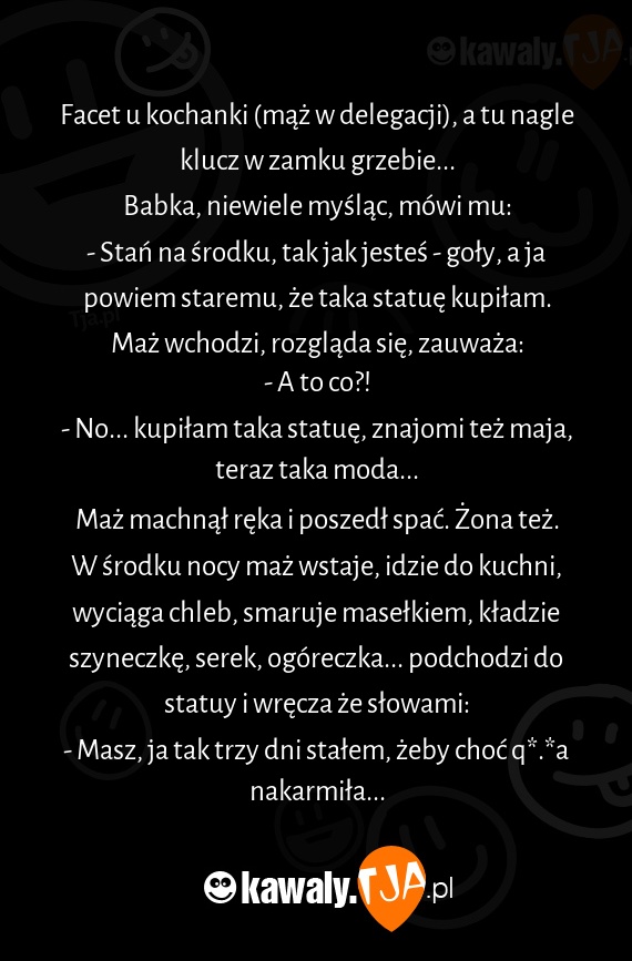 Maż machnął ręka i poszedł spać. Żona też. W środku nocy maż wstaje, idzie do kuchni, wyciąga chleb, smaruje masełkiem, kładzie szyneczkę, serek, ogóreczka... podchodzi do statuy i wręcza że słowami: