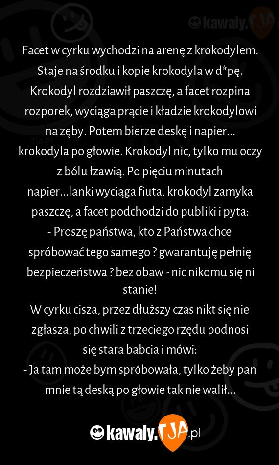 Facet w cyrku wychodzi na arenę z krokodylem. Staje na środku i kopie krokodyla w dupę. Krokodyl rozdziawił paszczę, a facet rozpina rozporek, wyciąga prącie i kładzie krokodylowi na zęby. Potem bierze deskę i napier... krokodyla po głowie. Krokodyl nic, tylko mu oczy z bólu łzawią. Po pięciu minutach napier...lanki wyciąga fiuta, krokodyl zamyka paszczę, a facet podchodzi do publiki i pyta: