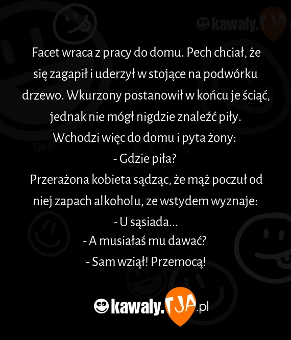 Facet wraca z pracy do domu. Pech chciał, że się zagapił i uderzył w stojące na podwórku drzewo. Wkurzony postanowił w końcu je ściąć, jednak nie mógł nigdzie znaleźć piły.