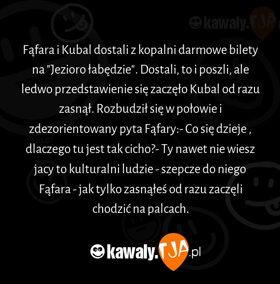 Fąfara i Kubal dostali z kopalni darmowe bilety na "Jezioro łabędzie". Dostali, to i poszli, ale ledwo przedstawienie się zaczęło Kubal od razu zasnął. Rozbudził się w połowie i zdezorientowany pyta Fąfary:- Co się dzieje , dlaczego tu jest tak cicho?- Ty nawet nie wiesz jacy to kulturalni ludzie - szepcze do niego Fąfara - jak tylko zasnąłeś od razu zaczęli chodzić na palcach.
