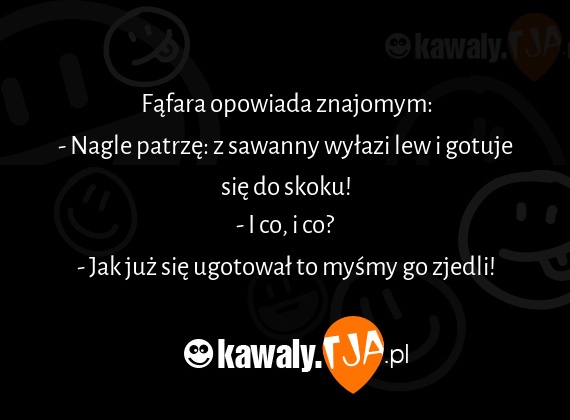 Fąfara opowiada znajomym: - Nagle patrzę: z sawanny wyłazi lew i gotuje się do skoku! - I co, i co? - Jak już się ugotował to myśmy go zjedli!