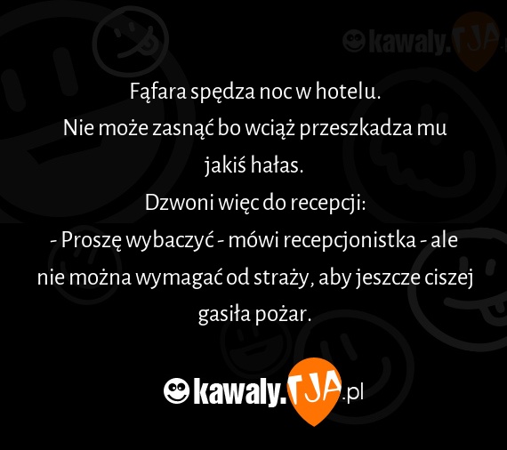 Fąfara spędza noc w hotelu. Nie może zasnąć bo wciąż przeszkadza mu jakiś hałas. Dzwoni więc do recepcji: - Proszę wybaczyć - mówi recepcjonistka - ale nie można wymagać od straży, aby jeszcze ciszej gasiła pożar.