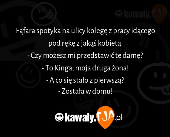 Fafara spotyka na ulicy kolege z pracy idacego pod reke z jakas kobieta. - Czy mozesz mi przedstawic te dame? - To Kinga, moja druga zona! - A co sie stalo z pierwsza? - Zostala w domu!