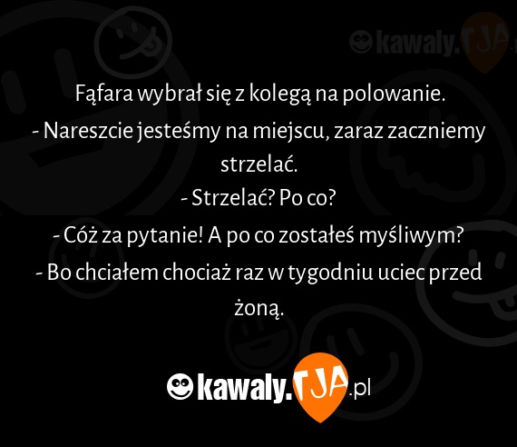 Fąfara wybrał się z kolegą na polowanie. - Nareszcie jesteśmy na miejscu, zaraz zaczniemy strzelać. - Strzelać? Po co? - Cóż za pytanie! A po co zostałeś myśliwym? - Bo chciałem chociaż raz w tygodniu uciec przed żoną.