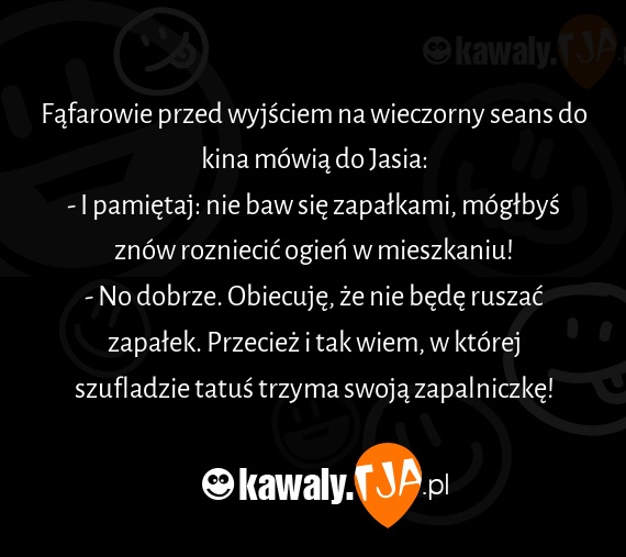 - No dobrze. Obiecuję, że nie będę ruszać zapałek. Przecież i tak wiem, w której szufladzie tatuś trzyma swoją zapalniczkę!