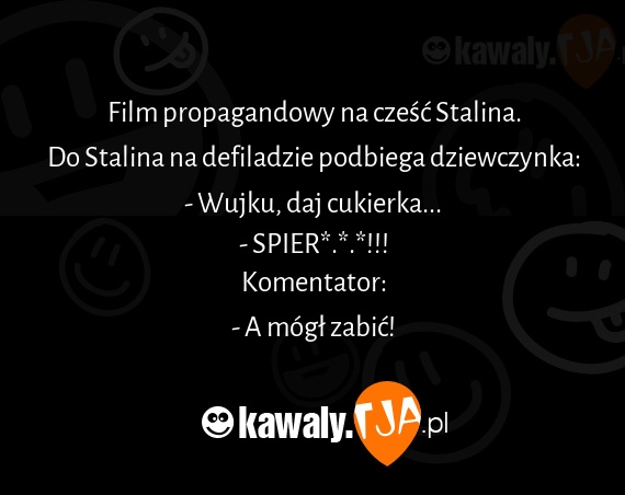 Film propagandowy na czesc Stalina. Do Stalina na defiladzie podbiega dziewczynka: - Wujku, daj cukierka... - SPIER*.*.*!!! Komentator: - A mogl zabic!