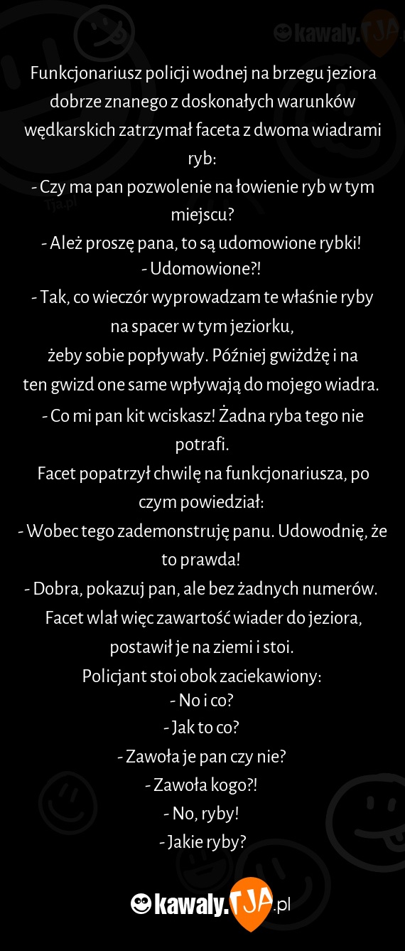 Funkcjonariusz policji wodnej na brzegu jeziora dobrze znanego z doskonałych warunków wędkarskich zatrzymał faceta z dwoma wiadrami ryb: