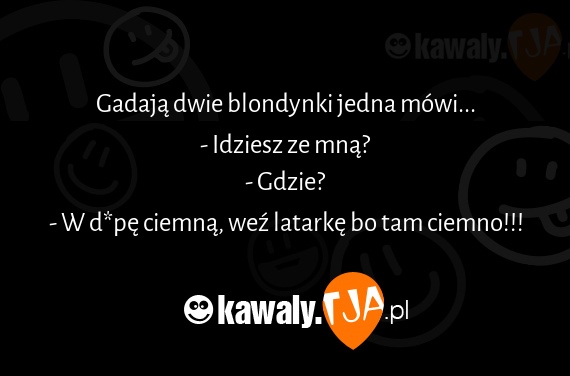 Gadają dwie blondynki jedna mówi... - Idziesz ze mną? - Gdzie? - W dupę ciemną, weź latarkę bo tam ciemno!!!