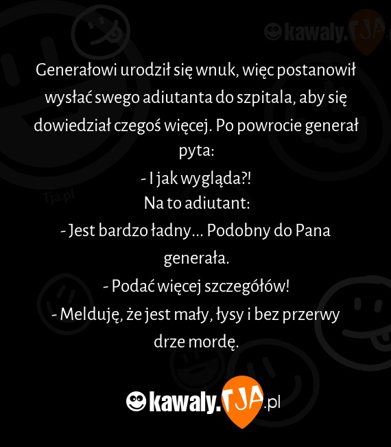 Generałowi urodził się wnuk, więc postanowił wysłać swego adiutanta do szpitala, aby się dowiedział czegoś więcej. Po powrocie generał pyta: