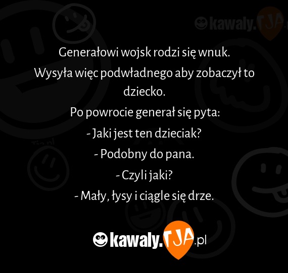 Generałowi wojsk rodzi się wnuk. Wysyła więc podwładnego aby zobaczył to dziecko. Po powrocie generał się pyta: - Jaki jest ten dzieciak? - Podobny do pana. - Czyli jaki? - Mały, łysy i ciągle się drze.